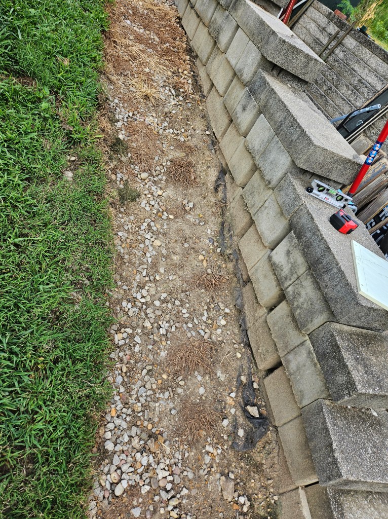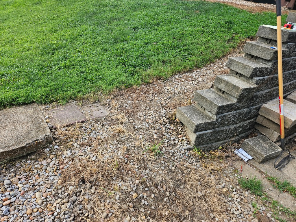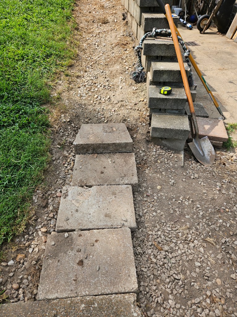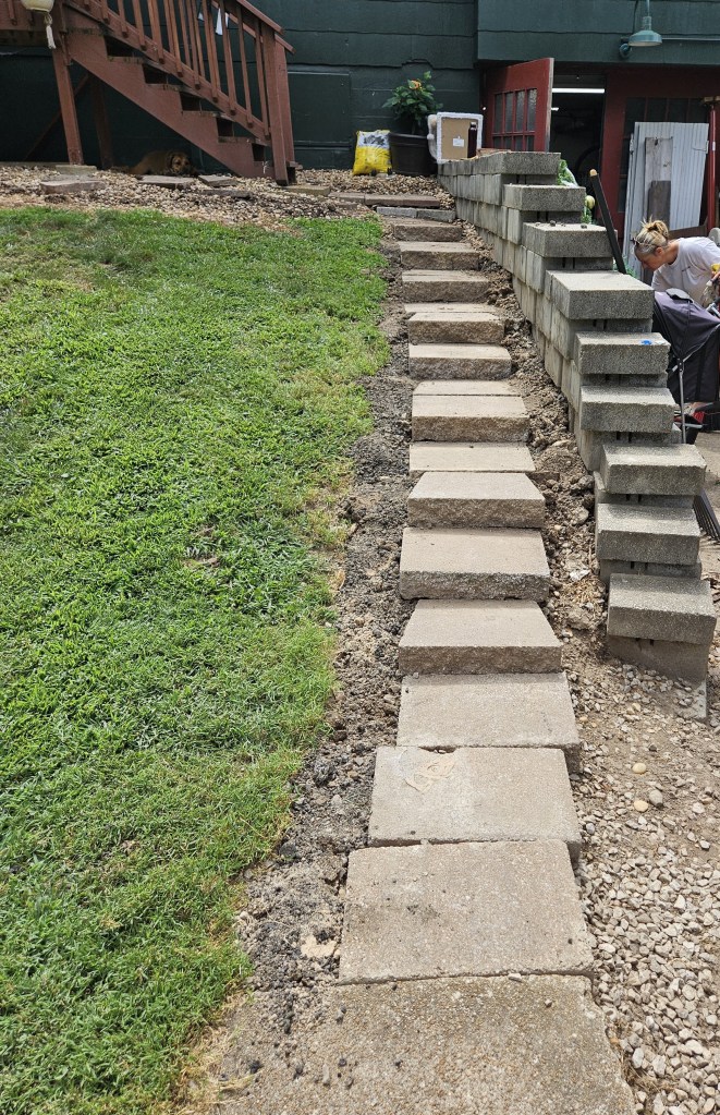 My task has been to reinstall steps along the same path. I used landscape pavers left over from past projects and only installed them into the dirt rather than with concrete. We will be remodeling our back stairs in a couple of years and adding a breakfast deck so the stairs will be replaced with permanent then. At this point, I just needed some sturdy temporary steps.