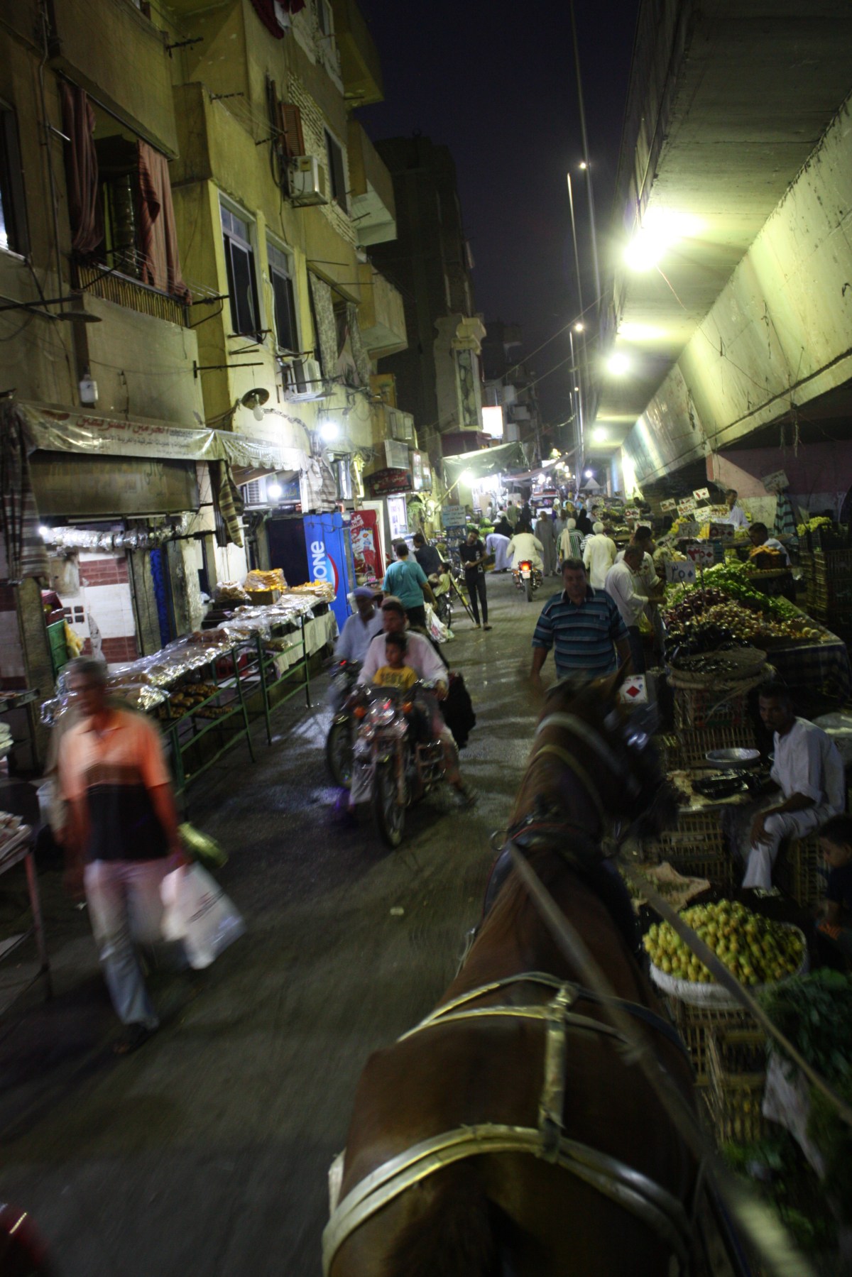When we went through, the market was not yet at full stride. It really doesn’t get going till around midnight and runs to till four or five in the morning. The streets through the market area were narrow and crowded. Sheri had been invited up to sit by the driver and steer the horse and, of course, jumped at the chance. She was excited until we got to the crowded streets, then she was all worried about running over someone.